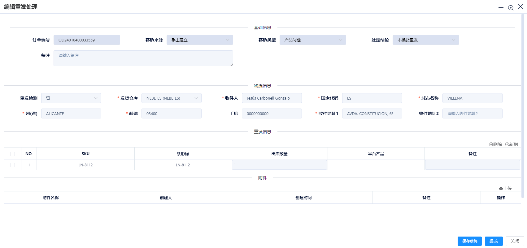 重发处理页面点击编辑按钮,填写必填项,点击保存。