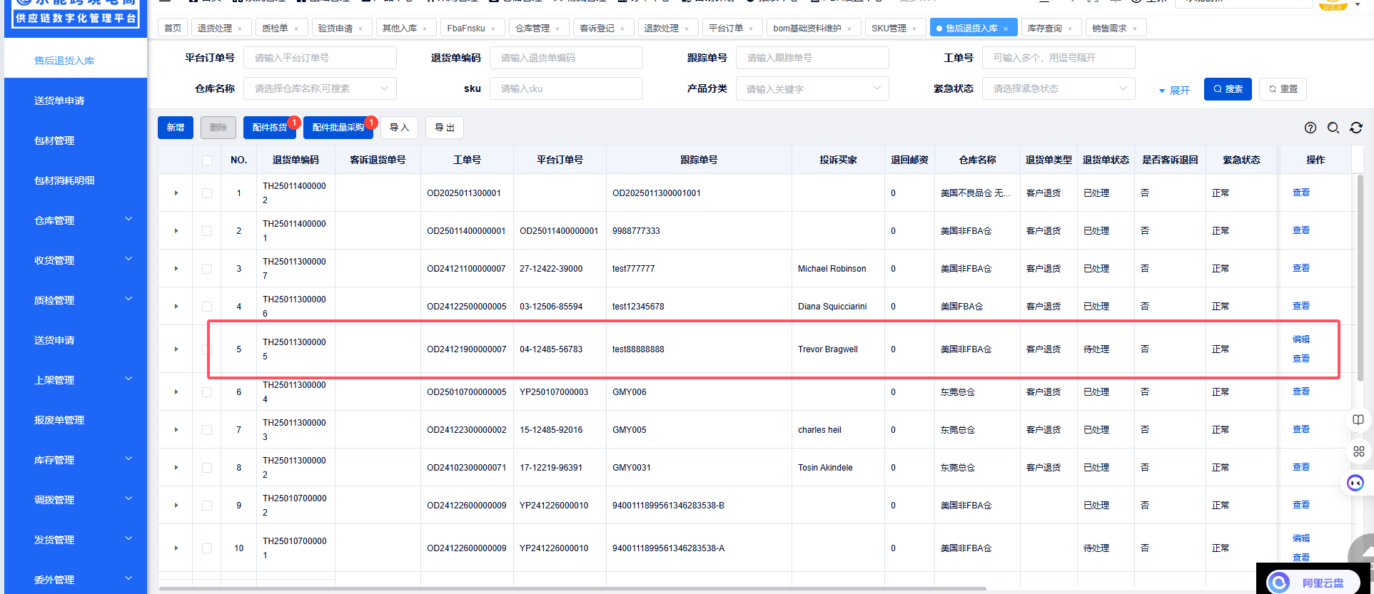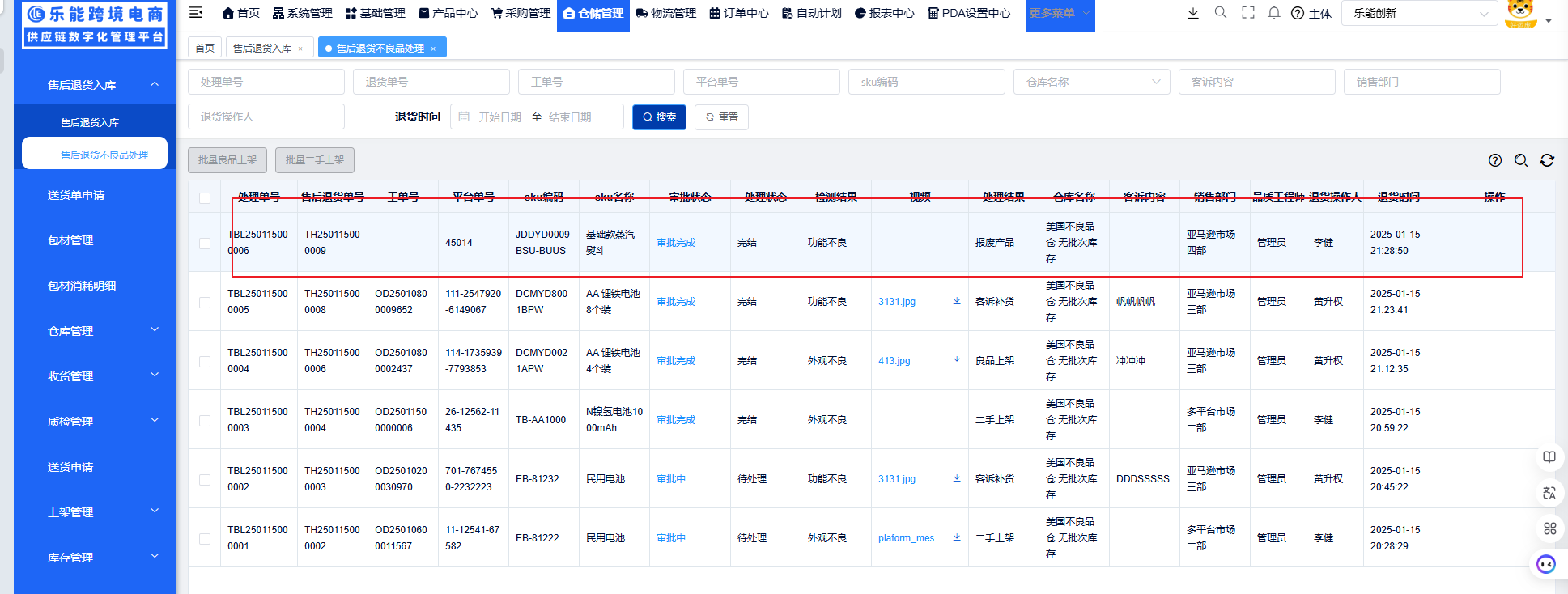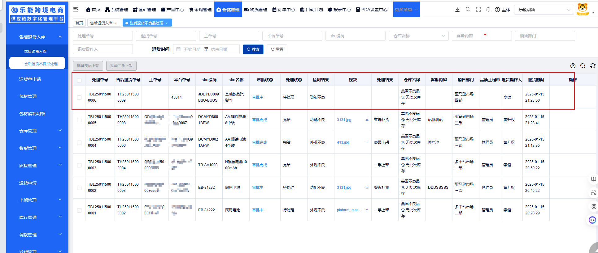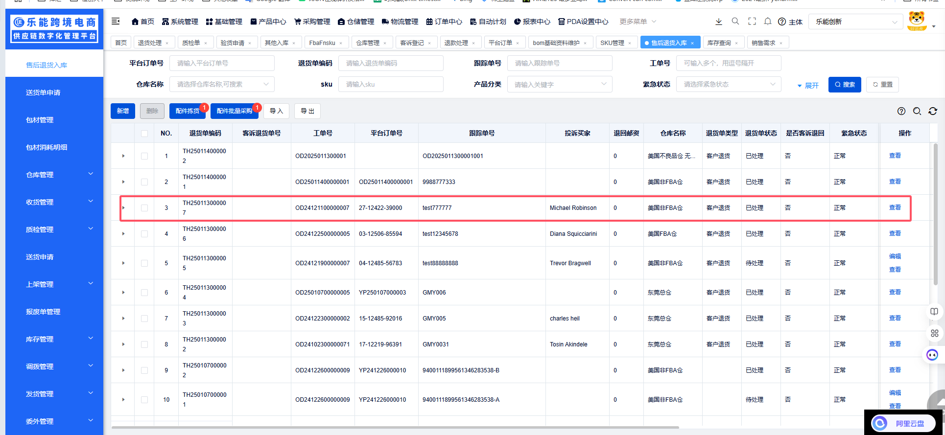 1.退货处理‘是否推送至仓库’字段选了‘是’,单据会推送到仓储管理-售后退货入库中,退货处理状态变成待收货。如果退回邮资大于50,退货订单紧急状态为加急。如果退回邮资小于50,退货订单紧急状态为正常。仓库收到货后,填写必填项,可以分批完成售后退货入库,完成后会把状态回传回到退货处理。