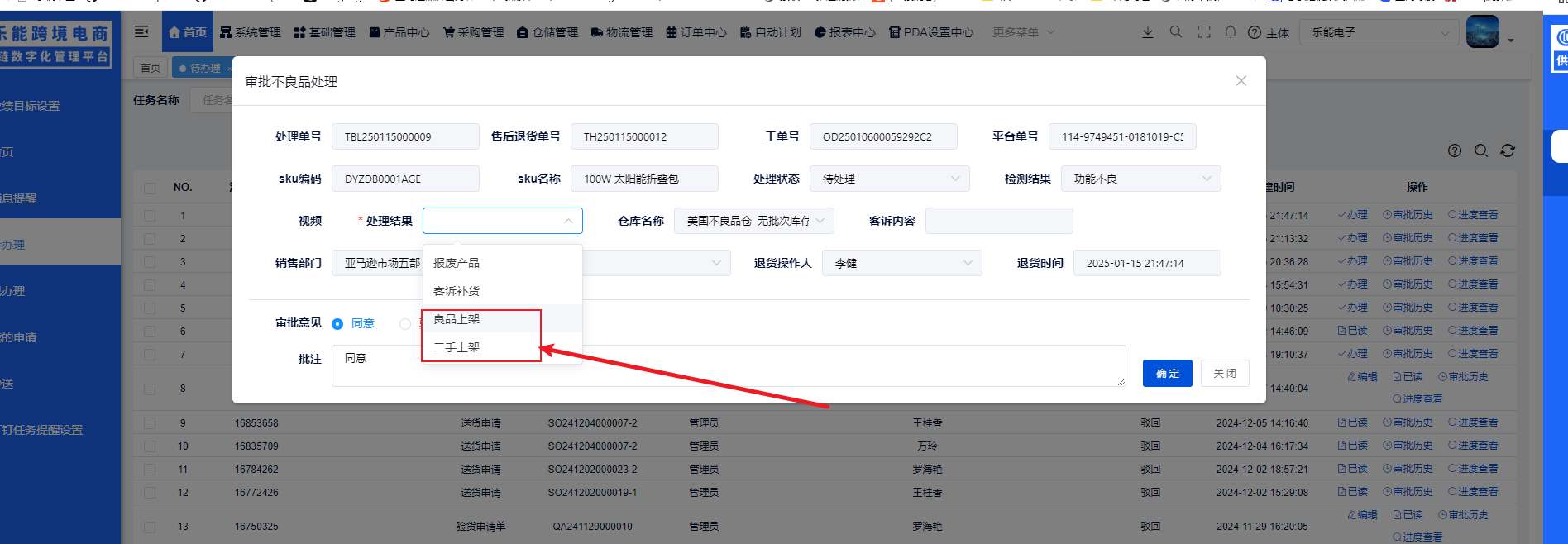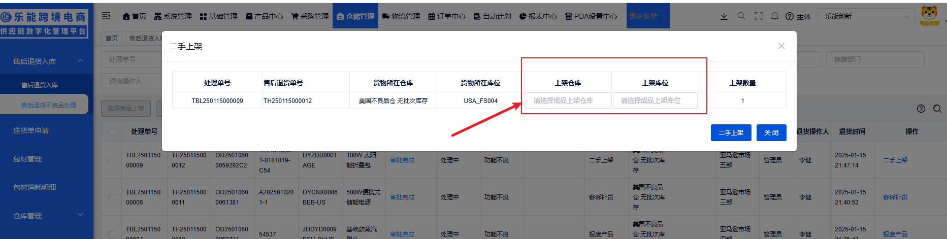 需要仓储部人员操作对应的上架良品仓和二手仓