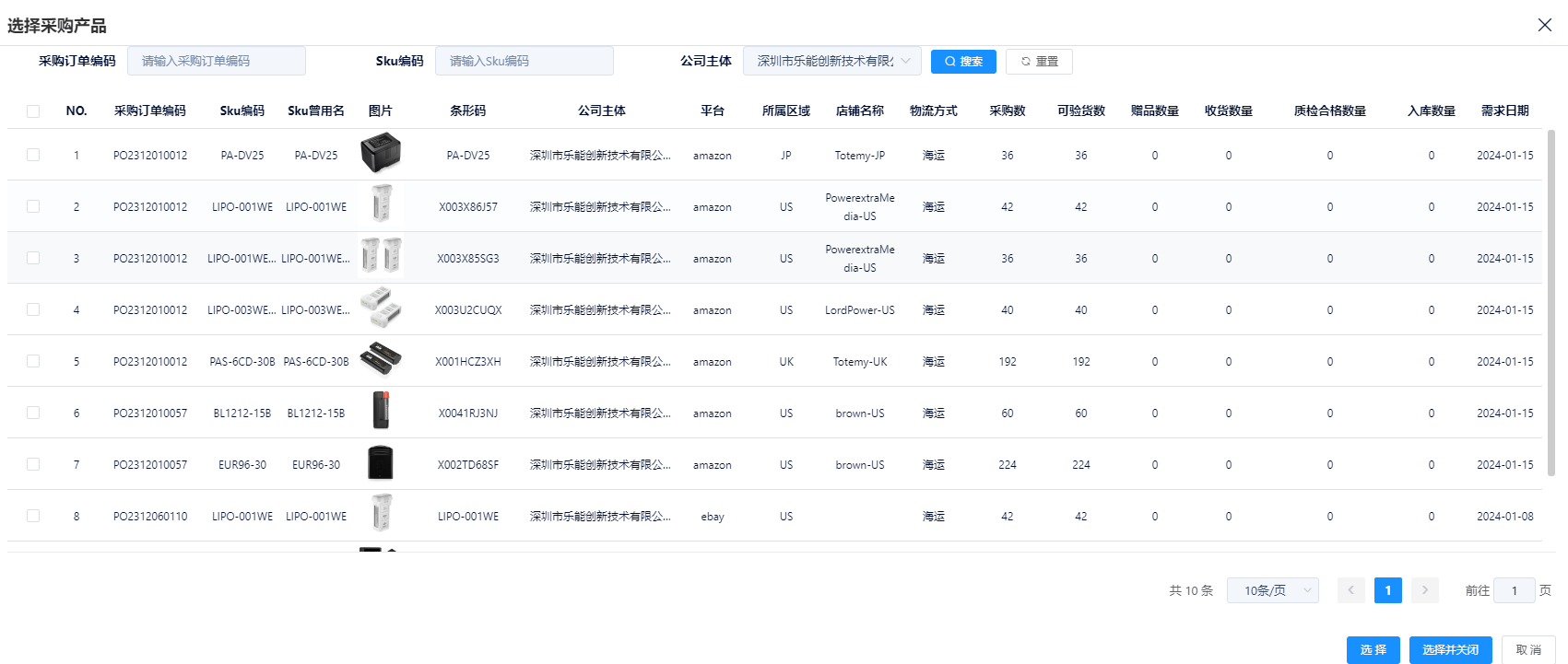 点击创建验货单按钮,弹窗出来之后,维护验货来源,验货类型,供应商信息,公司主体,验货时间等数据,并且新增可以添加可验货数不为0的采购订单数据,选择完成之后,可以修改预计验货数;