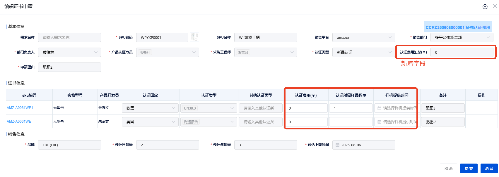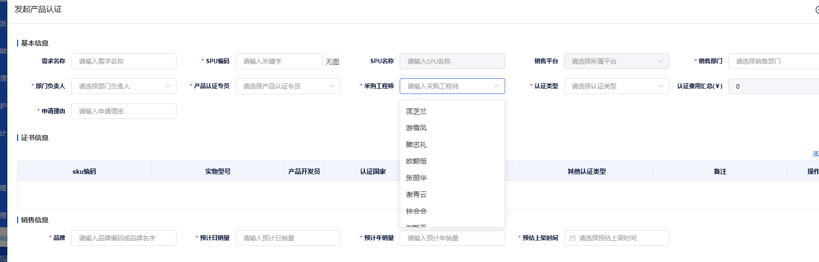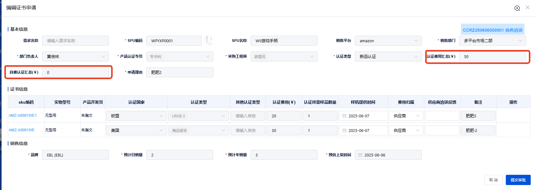 由采购工程师跟供应商洽谈认证费用归属于自费还是供应商,把商量的结果更新,如果自费,会当前的那一条费用自动汇总到自费认证汇总字段; 认证费用汇总是总费用