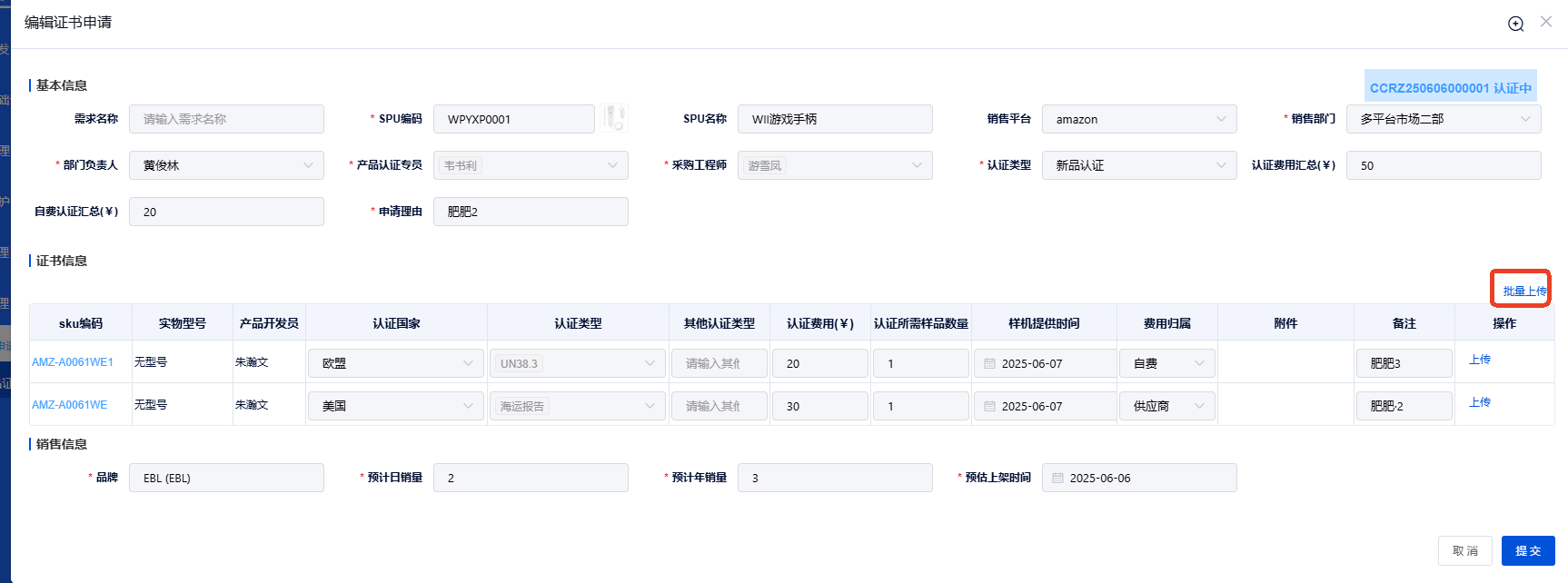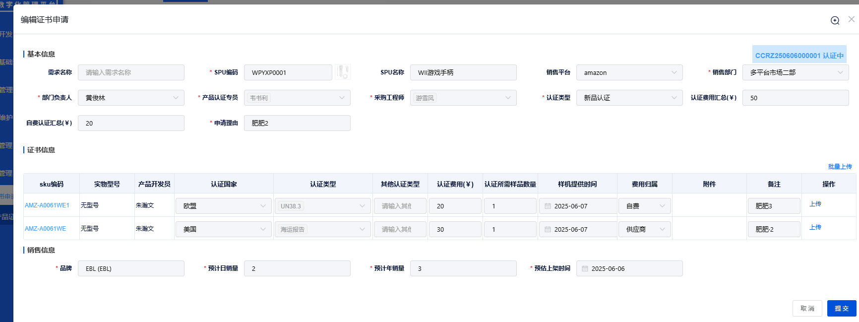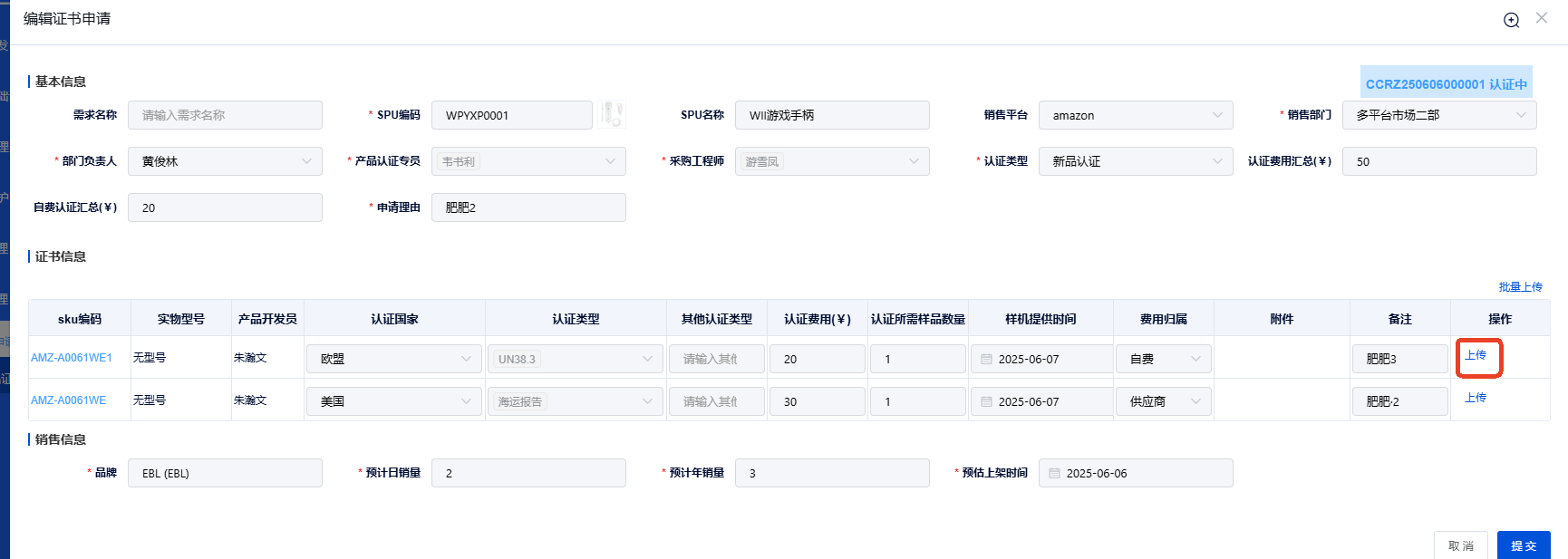 由采购工程师跟供应商洽谈认证费用归属于自费还是供应商,把商量的结果更新,如果自费,会当前的那一条费用自动汇总到自费认证汇总字段; 认证费用汇总是总费用