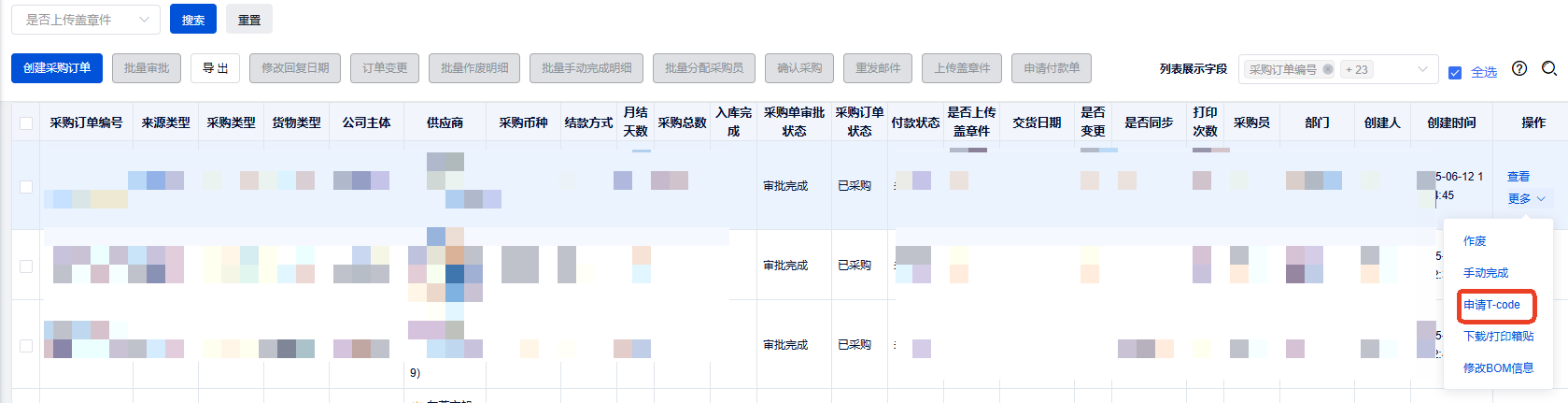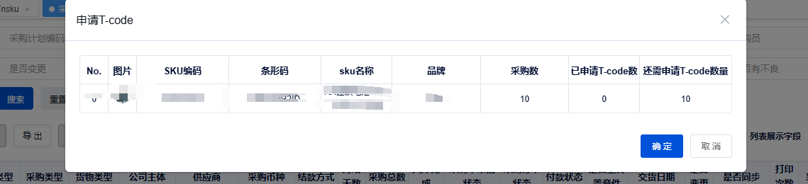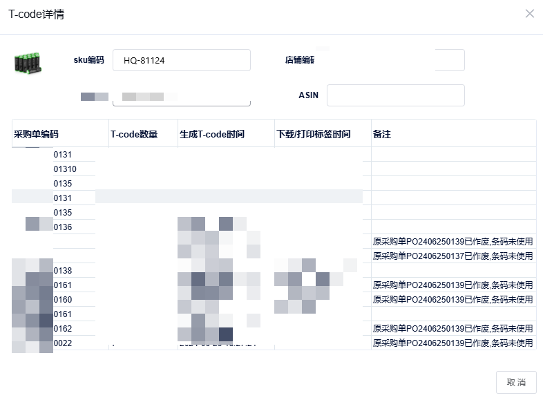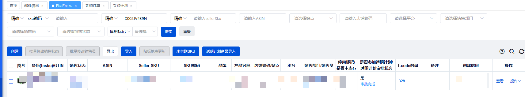 5.3 在采购订单中申请T-codee; 在申请成功之后,会在Fnsku中展示对应的T-code数量