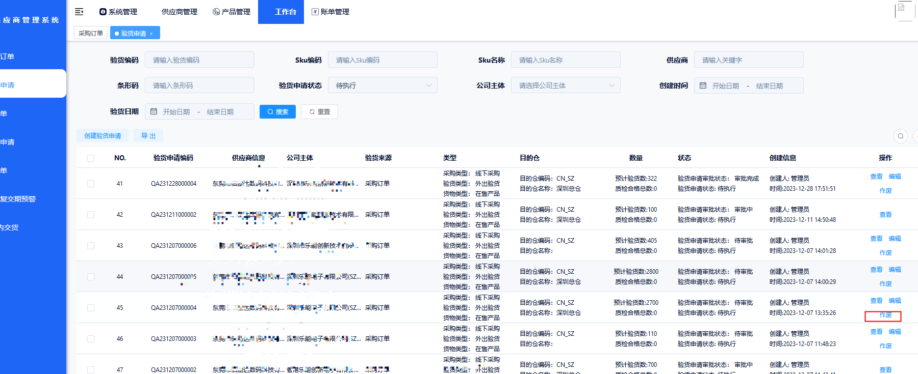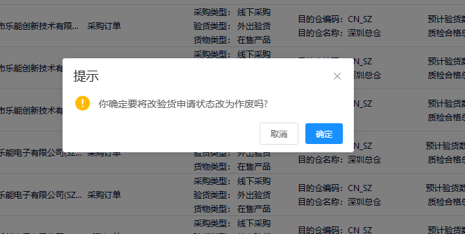 点击作废,再次弹窗出来之后,再点击确定,就可以把验货申请单整单作废。