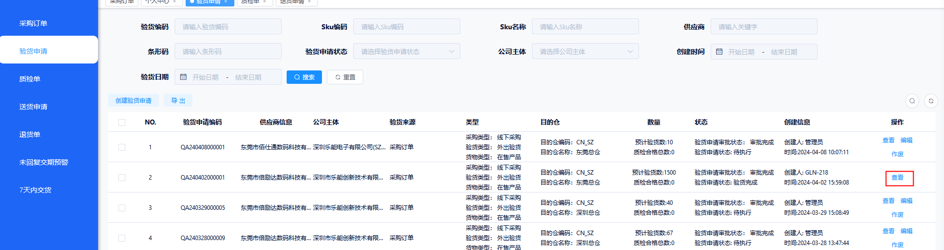 点击作废,再次弹窗出来之后,再点击确定,就可以把验货申请单整单作废。