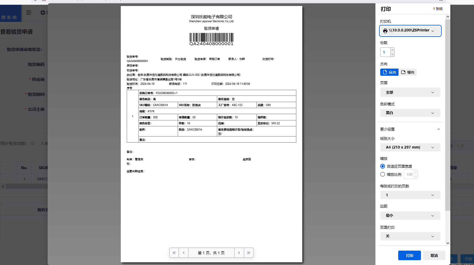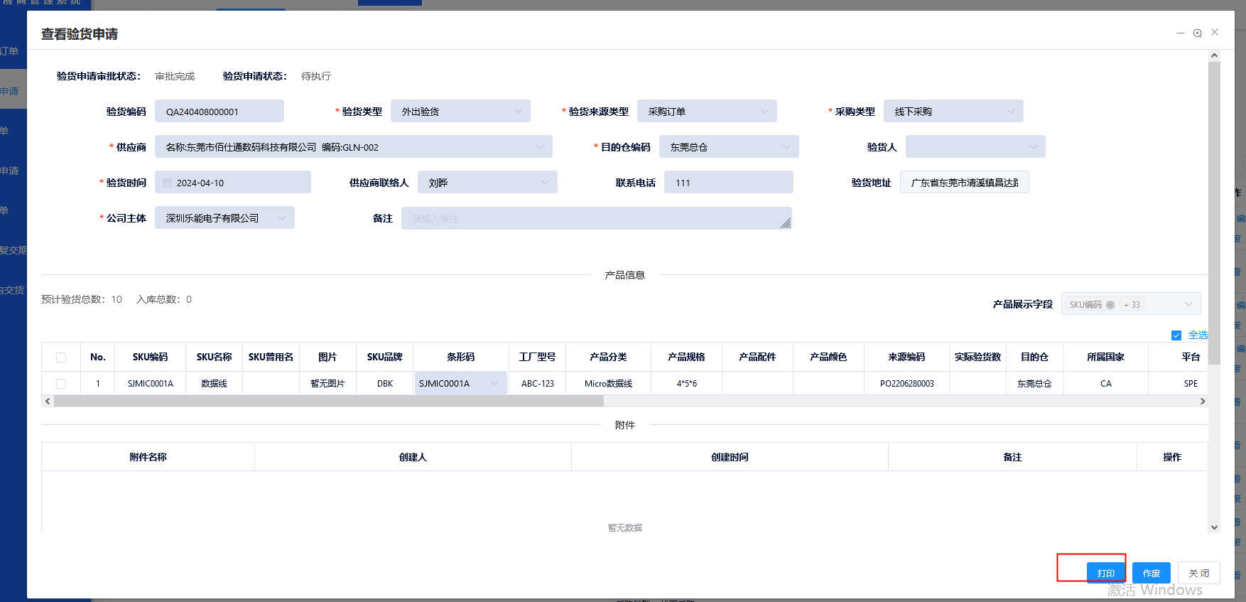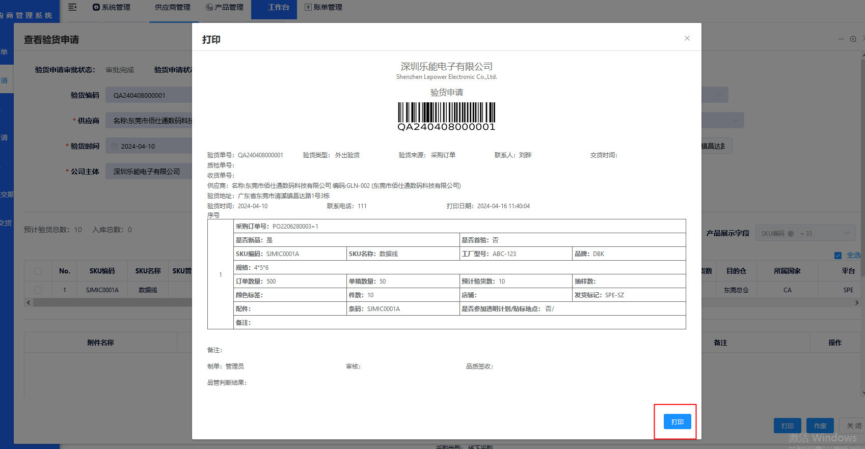 点击查看,弹窗之后,点击右下角打印按钮,再次弹窗出来之后,再点击打印,就可以把验货申请单内容打印出来。